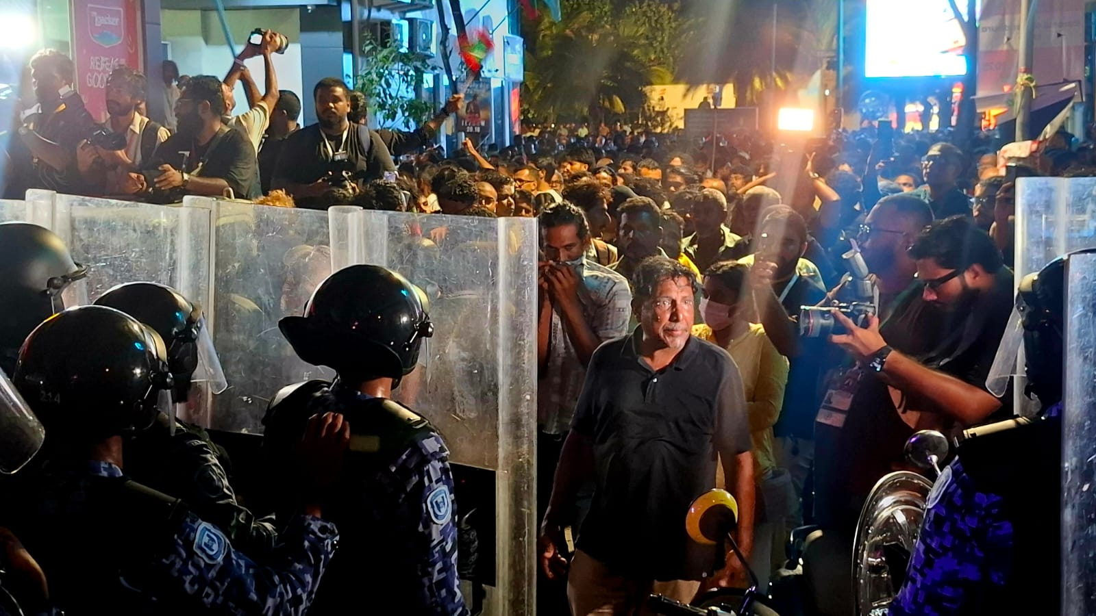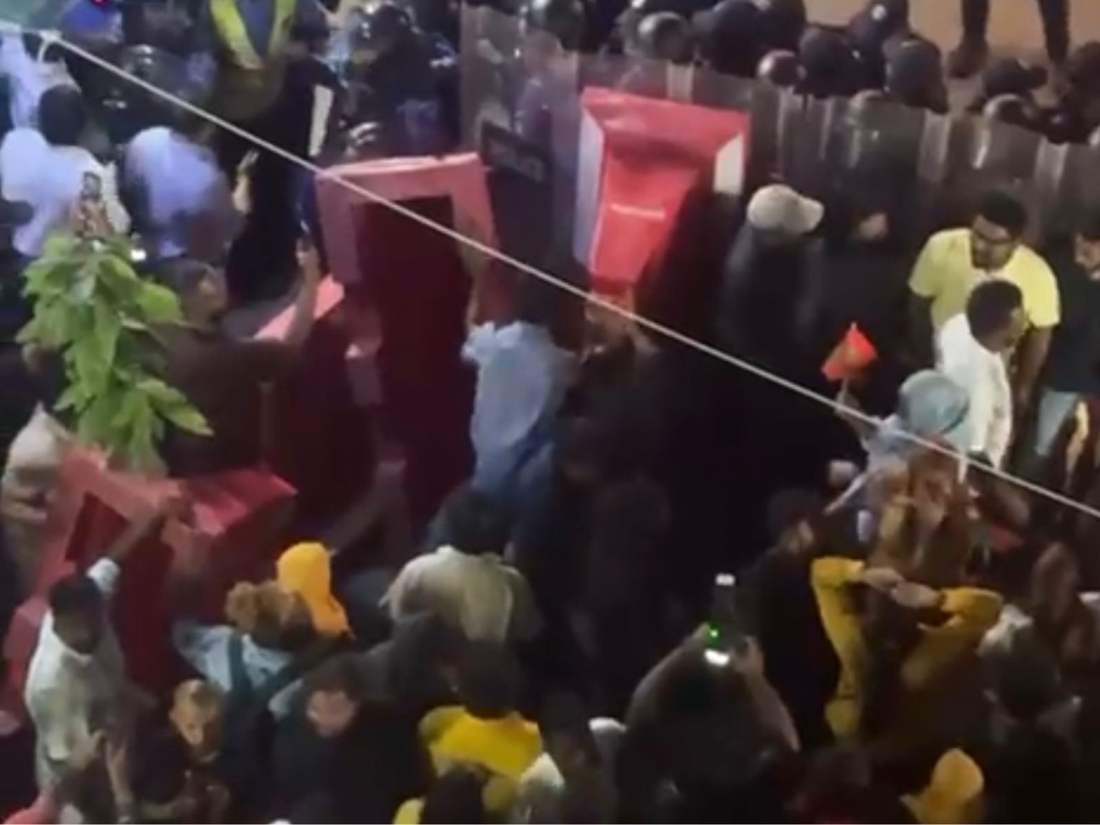 މުޒާހަރާގެ ބައިވެރީން ކުރިއަށްދާން ފުުރުސަތު ނުދިނުމުން ހަމަނުޖެހުން އުފެދުނެވެ. ބައެއް މީހުން ވަނީ ބެރިކޭޑްތައް އުކާލާފަ އެވެ.