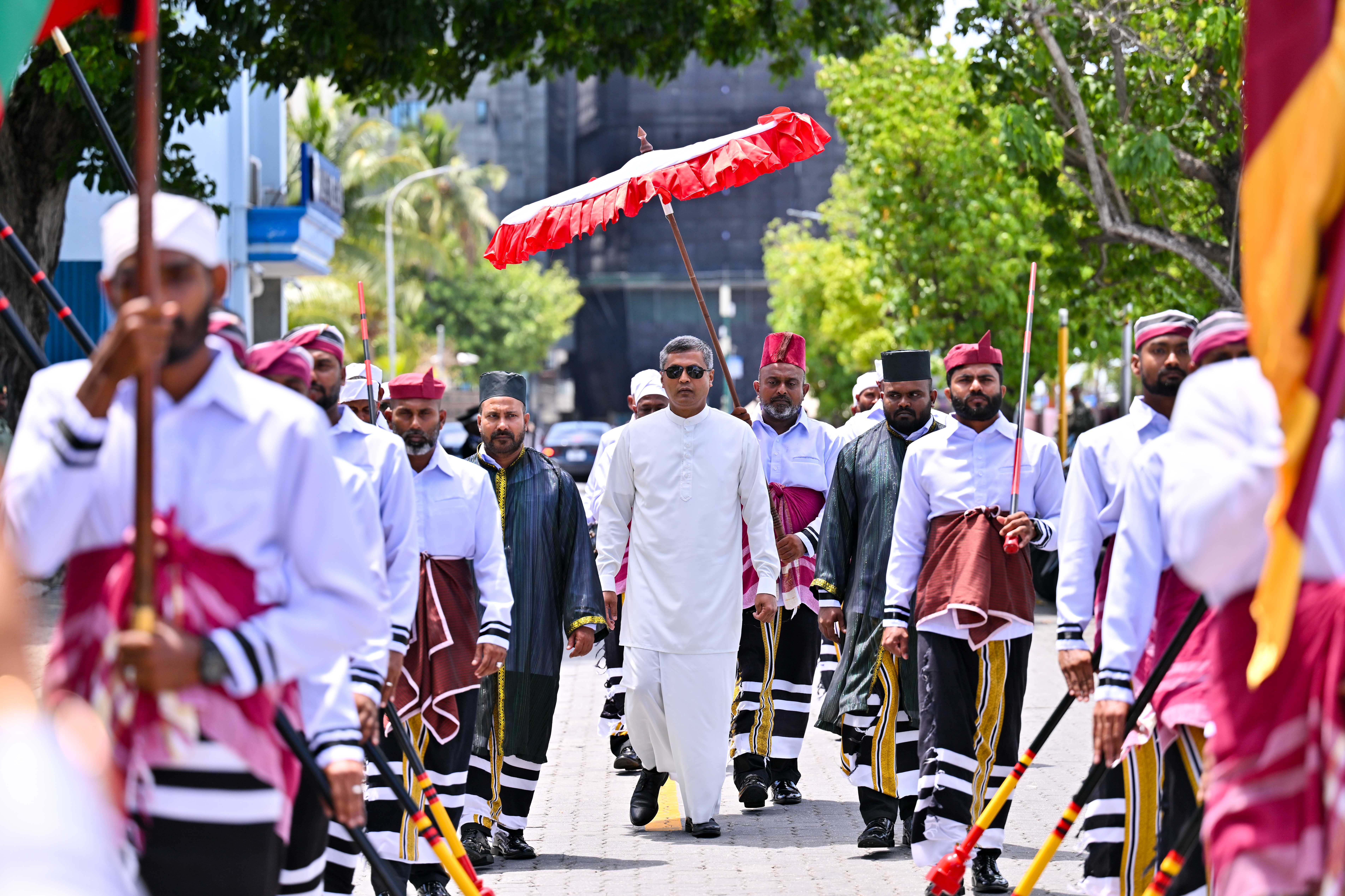 ޖުމްހޫރީ މައިދާނުން ފެށިގެން ރައީސުލްޖުމްހޫރިއްޔާގެ އޮފީހާ ހަމައަށް ސަފީރު ވަޑައިގެންނެވީ، ހަތްކޮޅުގައި، ރަސްމީ ޢިއްޒަތުގައި، ބެރުދުންމާރިތާޅަފިލީގައި، ހެވިކަމުގެ ލަޝްކަރުގެ ތެރޭގައި ހުންނަވައިގެން ހިންގަވާފަ އެވެ.