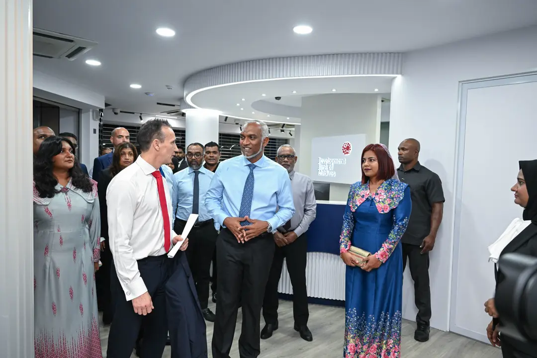 ޑީބީއެމް ހުޅުވުމުގެ ރަސްމިއްޔާތަށް ފަހު ރައީސް މުޢިއްޒު އަދި ޑީބީއެމްގެ ސީއީއޯ އަދި އޭރުގެ ކުންފުނީގެ ރަޖިސްޓްރާ އެ ބޭންކު ބައްލަވައިލައްވަނީ -- ފޮޓޯ: ރައީސް އޮފީސް