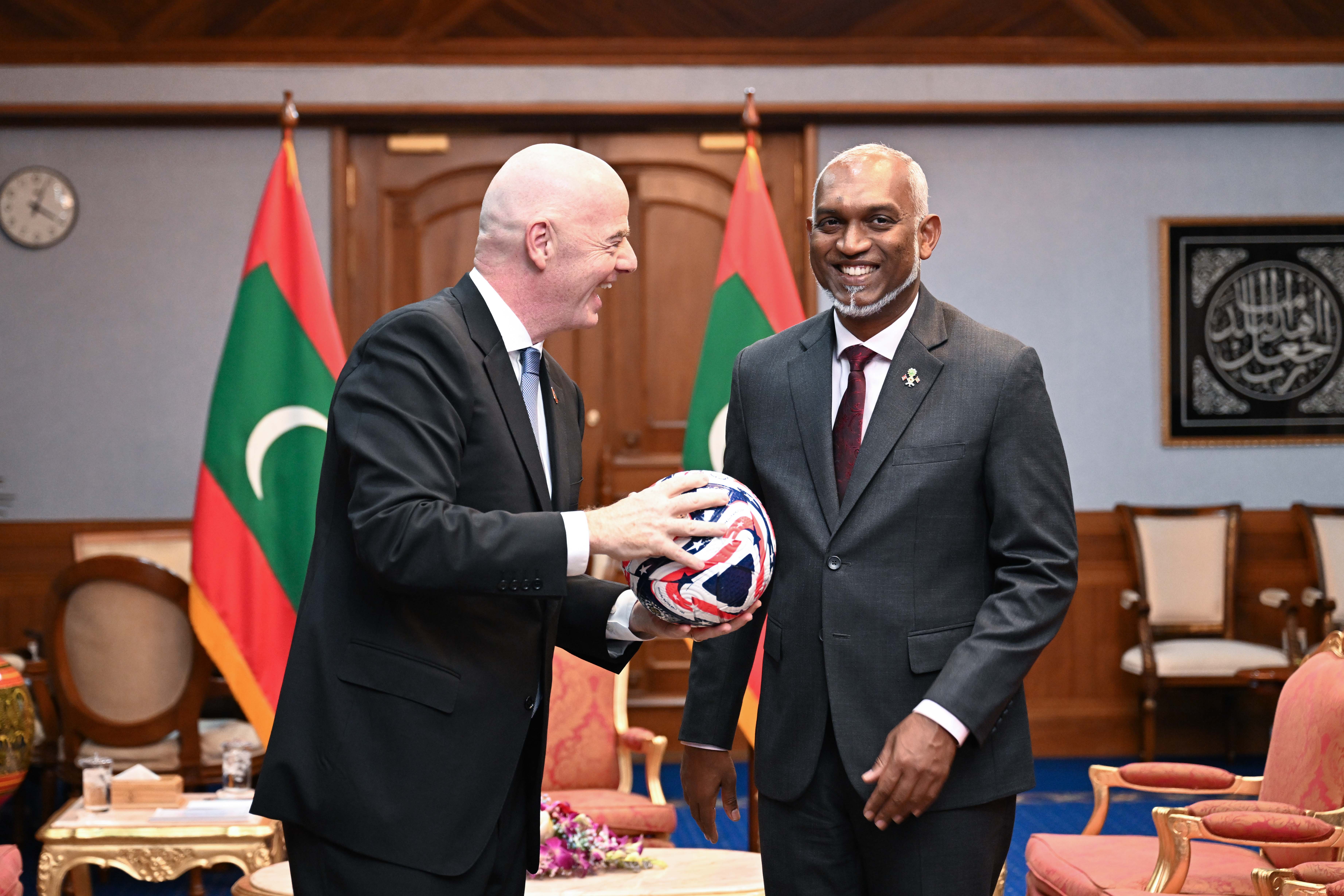 ދިވެހި ފުޓްބޯޅަ ކުރިއަރުވައި އެއްބާރުލުން ދިނުމާ ގުޅޭ ގޮތުން ރައީސުލްޖުމްހޫރިއްޔާ ޑރ. މުޙައްމަދު މުޢިއްޒު އާއި ފީފާގެ ރައީސް ޖިއާނީ އިންފަންޓީނޯ މަޝްވަރާ ކުރައްވައިފި އެވެ.