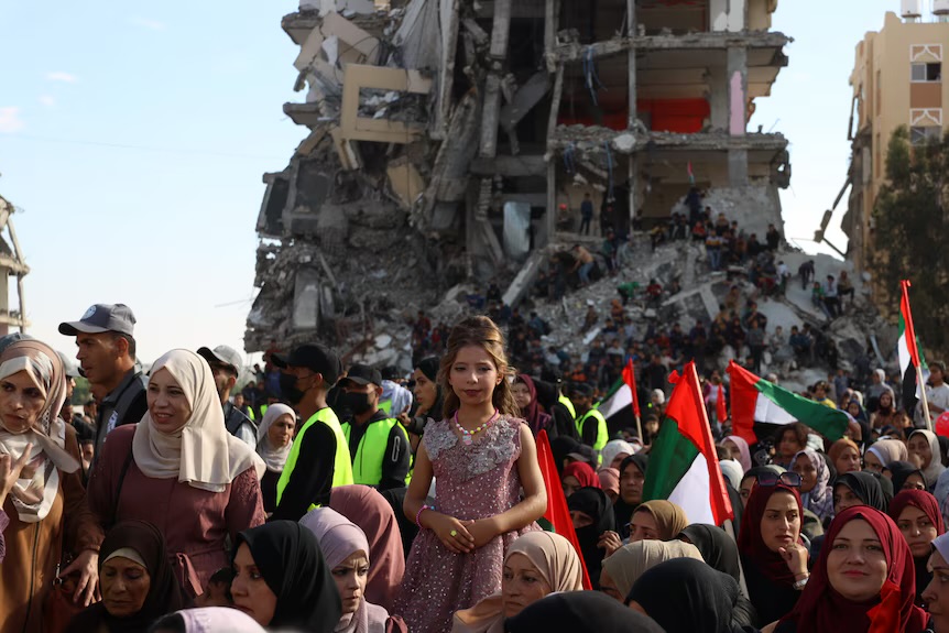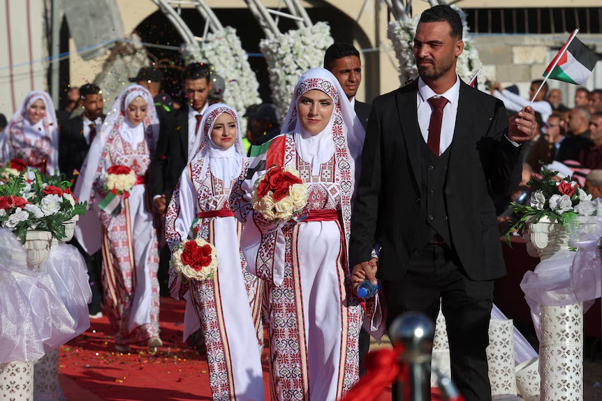 ފުނޑުފުނޑުވެފައިވާ އިމާރާތްތަކުގެ މެދުގައި ބޭއްވުނު މި ކައިވެނި ހަފްލާ ބަލަން އެތައް ހާސް ފަލަސްޠީނުގެ ރައްޔިތުން އެއްވެފައިވާއިރު، ހަލާކުވެފައިވާ އިމާރާތްތަކުގެ ބައިތަކަށް އަރައިގެންވެސް މީހުން ވަނީ މި ހަފްލާގެ މަންޒަރު ބަލާފައެވެ.