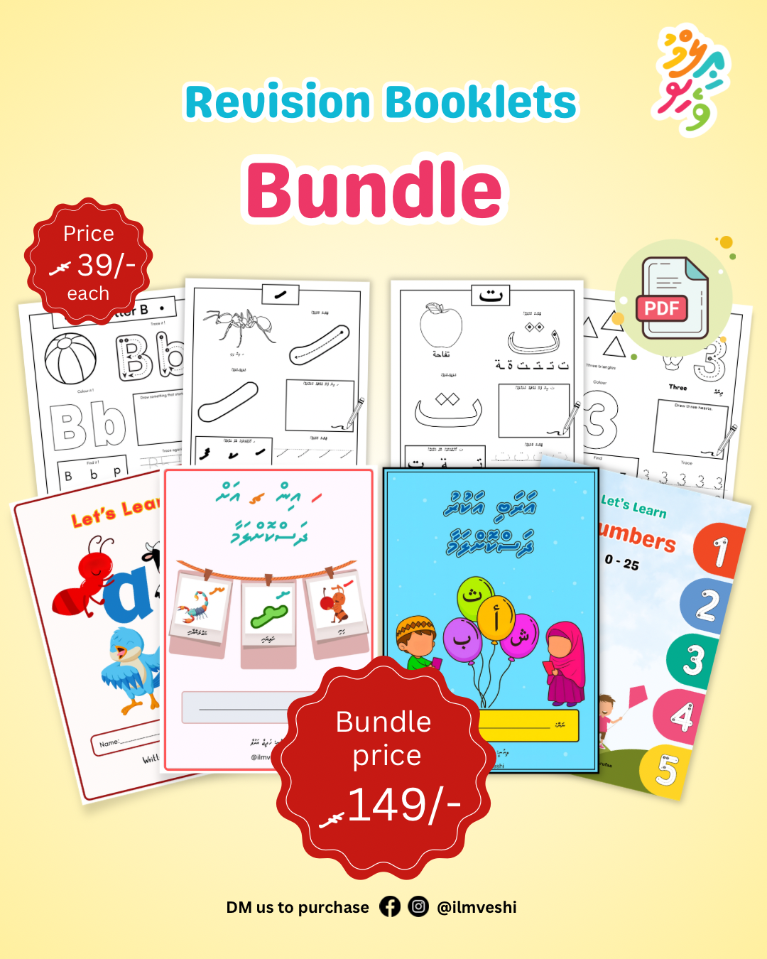ޢިލްމުވެށިން އެނިމޭޓެޑް ވީޑިއޯތަކުގެ އިތުރުން، ކުޑަކުދިންގެ ކިޔެވުމަށް އެހީތެރިވެދިނުމަށް ޕީޑީއެފް ވޯކްޝީޓްސްވެސް ވިއްކައެވެ. އަދި ބައެއް ވޯކްޝީޓްތައް ހިލޭވެސް ލިބެން ހުންނަކަން ފާހަގަކޮށްފައިވެއެވެ. ޕީޑީއެފް ފައިލްތައް ގަންނަން ބޭނުންވާ ފަރާތްތަކުން ޢިލްމުވެށީގެ އިންސްޓަގްރާމް ނުވަތަ ފޭސްބުކް ޕޭޖަށް މެސެޖް ކޮށްލުމުން އެ ފައިލްތައް ލިބިގެންދާނެ ކަމަށާ، އަދި ހިލޭ ލިބޭ ވޯކްޝީޓްތަކުގެ ޕީޑީއެފް ފައިލްތައް ޢިލްމުވެށީގެ ވައިބާ ޗެނަލުން ފަސޭހަކަމާއެކު ޑައުންލޯޑް ކުރެވޭނެ ކަމަށް ބުނެފައިވެއެވެ.
