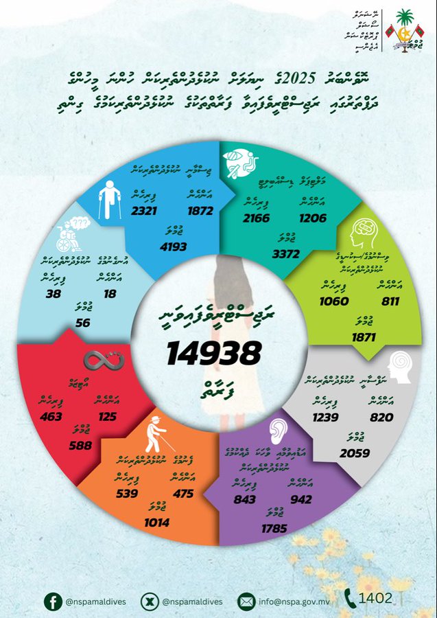 މީގެ އިތުރުން، މަލްޓިޕަލް ޑިސެބިލިޓީ ހުންނަ މީހުންގެ ގޮތުގައި 1206 އަންހެނުންނާއި، 2166 ފިރިހެނުން ހިމެނޭނެހެން ޖުުމުލަ 3372 ފަރާތަކުން ރަޖިސްޓްރީވެފައިވެއެވެ. އަދި ވިސްނުމުގެ/ސިކުނޑީގެ ނުކުޅެދުންތެރިކަން ހުންނަ މީހުންގެ ގޮތުގައި 811 އަންހެނުންނާއި، 1060 ފިރިހެނުން (ޖުމުލަ 1871 މީހުން)، ނަފްސާނީ ނުކުޅެދުންތެރިކަން ހުންނަ މީހުންގެ ގޮތުގައި 820 އަންހެނުންނާއި، 1239 ފިރިހެނުން (ޖުމުލަ 2059 މީހުން)، އަޑުއިވުމާއި ވާހަކަދެއްކުމުގެ ނުކުޅެދުންތެރިކަން ހުންނަ މީހުންގެ ގޮތުގައި 942 އަންހެނުންނާއި، 843 ފިރިހެނުން (ޖުމުލަ 1785 މީހުން)، ފެނުމުގެ ނުކުޅެދުންތެރިކަން ހުންނަ މީހުންގެ ގޮތުގައި 475 އަންހެނުންނާއި، 539 ފިރިހެނުން (ޖުމުލަ 1014 މީހުން)، އޯޓިޒަމް ހުންނަ މީހުންގެ ގޮތުގައި 125 އަންހެނުންނާއި، 463 ފިރިހެނުން (ޖުމުލަ 588 މީހުން) އަދި އުނގެނުމުގެ ނުކުޅެދުންތެރިކަން ހުންނަ މީހުންގެ ގޮތުގައި 18 އަންހެނުންނާއި، 38 ފިރިހެނުން (ޖުމުލަ 56 މީހުން) ރަޖިސްޓްރީކޮށްފައިވެއެވެ.