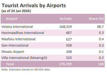 ޓޫރިޒަމް މިނިސްޓްރީން މިއަދު ނެރެ އާއްމުކޮށްފައިވާ ތަފާސްހިސާބުތަކަށް ބަލާއިރު، އިއްޔެގެ ނިޔަލަށް ރާއްޖެއަށް އެންމެގިނައިން ފަތުރުވެރިން ޒިޔާރަތްކޮށްފައިވަނީ، ވެލާނާ އިންޓަރނޭޝަނަލް އެއާޕޯޓަށެވެ. މިހިނގާ ޖެނުއަރީމަހުގެ 24 ގެ ނިޔަލަށް ވީއައިއޭއަށް 168,559 ފަތުރުވެރިން ޒިޔާރަތްކޮށްފައިވާއިރު، މި މުއްދަތުގެ ތެރޭގައި މާފަރު އިންޓަރނޭޝަނަލް އެއާޕޯޓަށް ވަނީ، 487 ފަތުރުވެރިން ޒިޔާރަތްކޮށްފައެވެ.