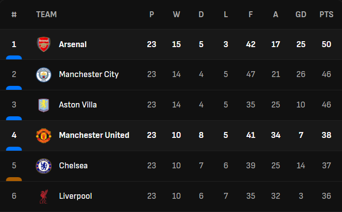 ރޭގެ މެޗަށްފަހު ޕްރިމިއާ ލީގް ތާވަލް މިހާރު އޮތްގޮތަށް ބަލާއިރު، 4 ޕޮއިންޓްގެ ލީޑަކާއެކު ތާވަލްގެ އެއްވަނާގައި އަދިވެސް އޮތީ އާސެނަލެވެ.