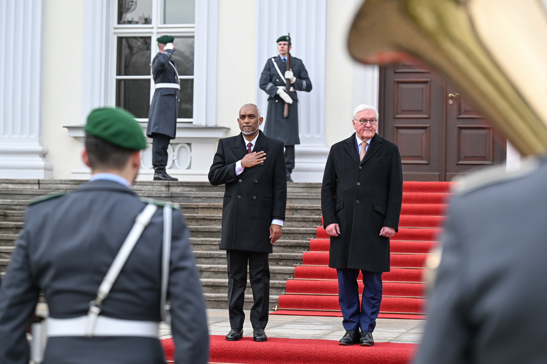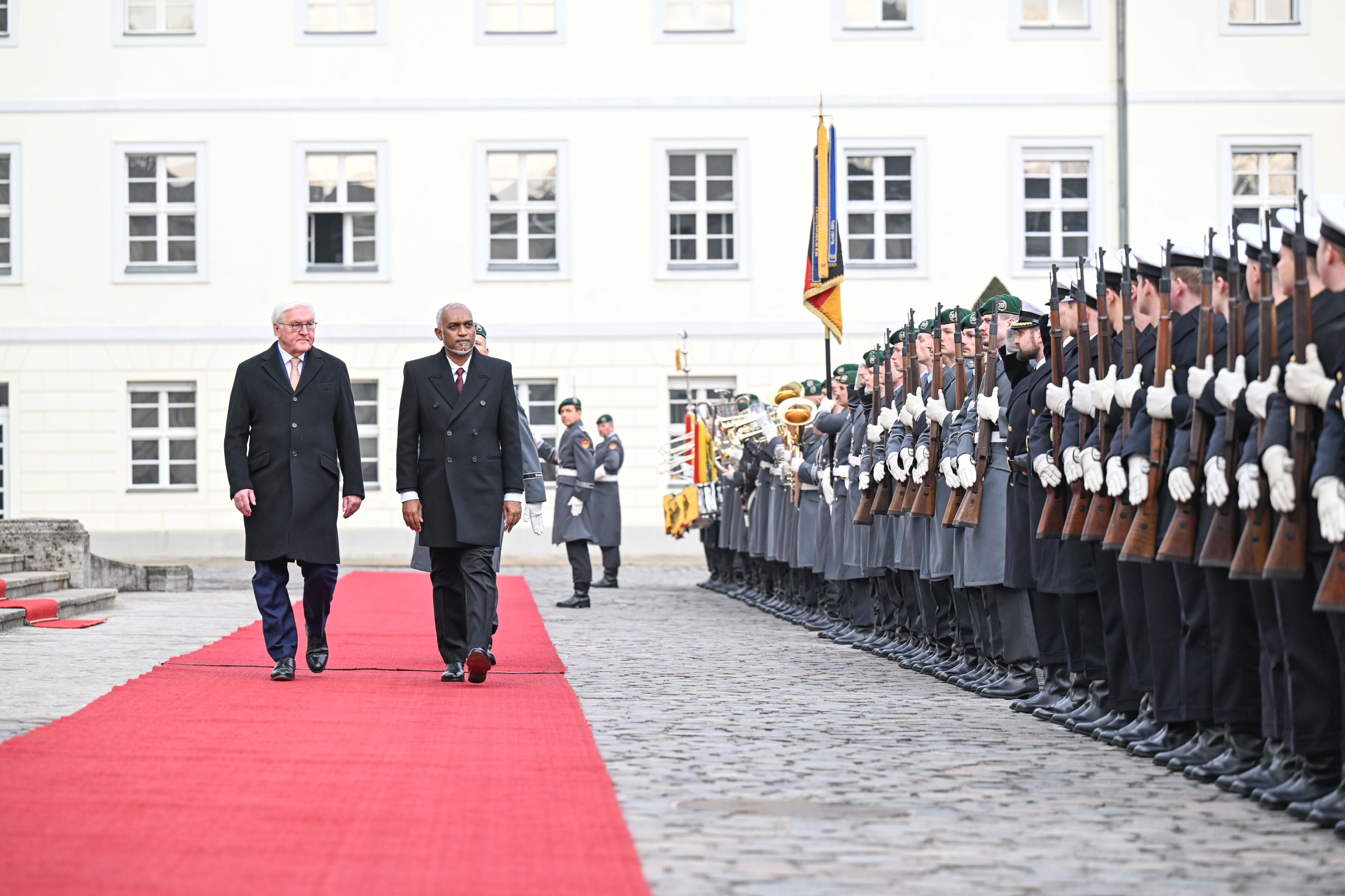 ޖަރުމަނުވިލާތުގެ ރައީސް ފްރޭންކް-ވޯލްޓަރ ޝްޓައިންމަޔަރގެ ދަޢުވަތަކަށް ރައީސުލްޖުމްހޫރިއްޔާ ޑރ. މުޙައްމަދު މުޢިއްޒު، މިހާރު އެގައުމަށް ކުރައްވާ ދަތުރުފުޅުގައި، އެމަނިކުފާނަށާއި އެމަނިކުފާނުގެ ވަފުދަށް ރަސްމީގޮތުން މަރުޙަބާ ދަންނަވައިފި އެވެ.