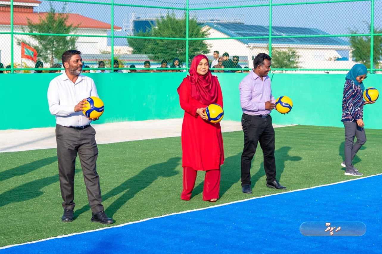 ވޮލީބޯޅަ ކޯޓް ރަސްމީކޮށް ހުޅުވުމަށް ބޭއްވި ރަސްމިއްޔާތަށް މެޑަމް ސާޖިދާ ވަޑައިގަތުމުން މަރުޙަބާ ދެންނެވީ ކުޅިވަރާއި ހަށިހެޔޮކަމާ ބެހޭ ވަޒީރު ޢަބްދުالله ރާފިޢުއާއި އެވުޒާރާގެ އިސްވެރިން އަދި ރަށުގެ މުއައްސާތަކުގެ އިސްވެރިންނެވެ.