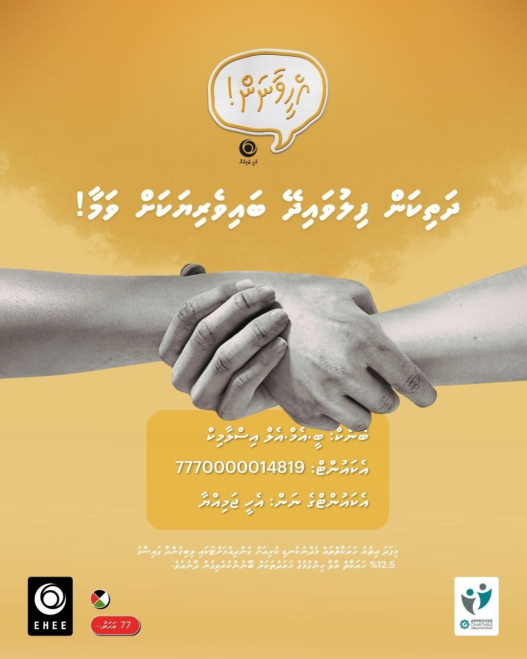 އެގޮތުން އެހީވާން ބޭނުންވާ ފަރާތްތަކުން އަންނަނިވި އެކައުންޓަށް ފައިސާ ޖަމާކުރުމަށް އެ ޖަމިއްޔާއިން އެދެއެވެ.