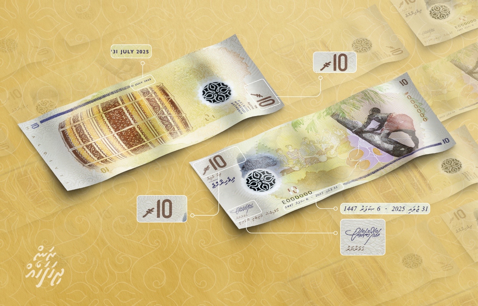 އަލަށް ނެރޭ 10 ރުފިޔާގެ ނޫޓުގައި ސޮއިކޮށްފައި ވަނީ އެމްއެމްއޭގެ ގަވަރުނަރު އަޙްމަދު މުނައްވަރެވެ. އަދި ނޫޓުގައި ވަނީ 2025 ވަނަ އަހަރުގެ ޖުލައި 31 ގެ ތާރީޚެވެ. އަދި، 10 ރުފިޔާގެ މި އައު ޗާޕުގެ ދެފުށުގައި ދިވެހި ރުފިޔާގެ ނިޝާން ހިމަނާފައިވާނެ ކަމަށް އެމްއެމްއޭއިން ހާމަކުރެއެވެ.