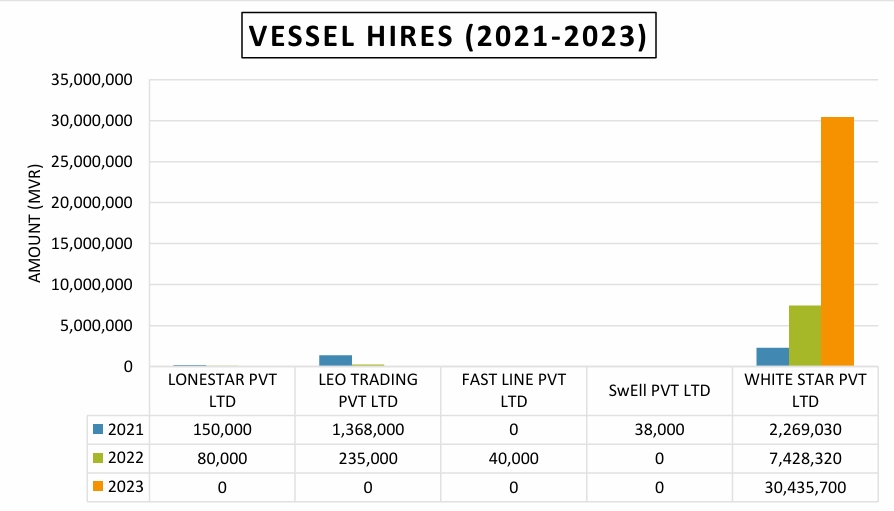 އުޅަނދުތައް ކުއްޔަށް ހިފުމުގައި ވަކި ކުންފުންޏަކަށް ބަރޯސާވެފައިވާ މިންވަރު ބޮޑުކަންވެސް އޮޑިޓުން ދައްކައެވެ. ހާއްސަކޮށް "ވައިޓް ސްޓާ ޕްރައިވެޓް ލިމިޓެޑް" އަށް ދީފައިވާ މަސައްކަތްތަކުގައި، އަގުތައް ވަނީ ބޮޑުތަނުން އުފުލިފައެވެ. 2021 ވަނަ އަހަރު ދަތުރަކަށް އެވްރެޖްކޮށް 81,037 ރުފިޔާ ހޭދަވި ނަމަވެސް، 2023 ވަނަ އަހަރު މި އަގު ވަނީ 317,038 ރުފިޔާއަށް އުފުލިފައެވެ. މިއީ ދެ އަހަރު ތެރޭގައި ގާތްގަނޑަކަށް ތިން ގުނައިގެ އިތުރުވުމެކެވެ.