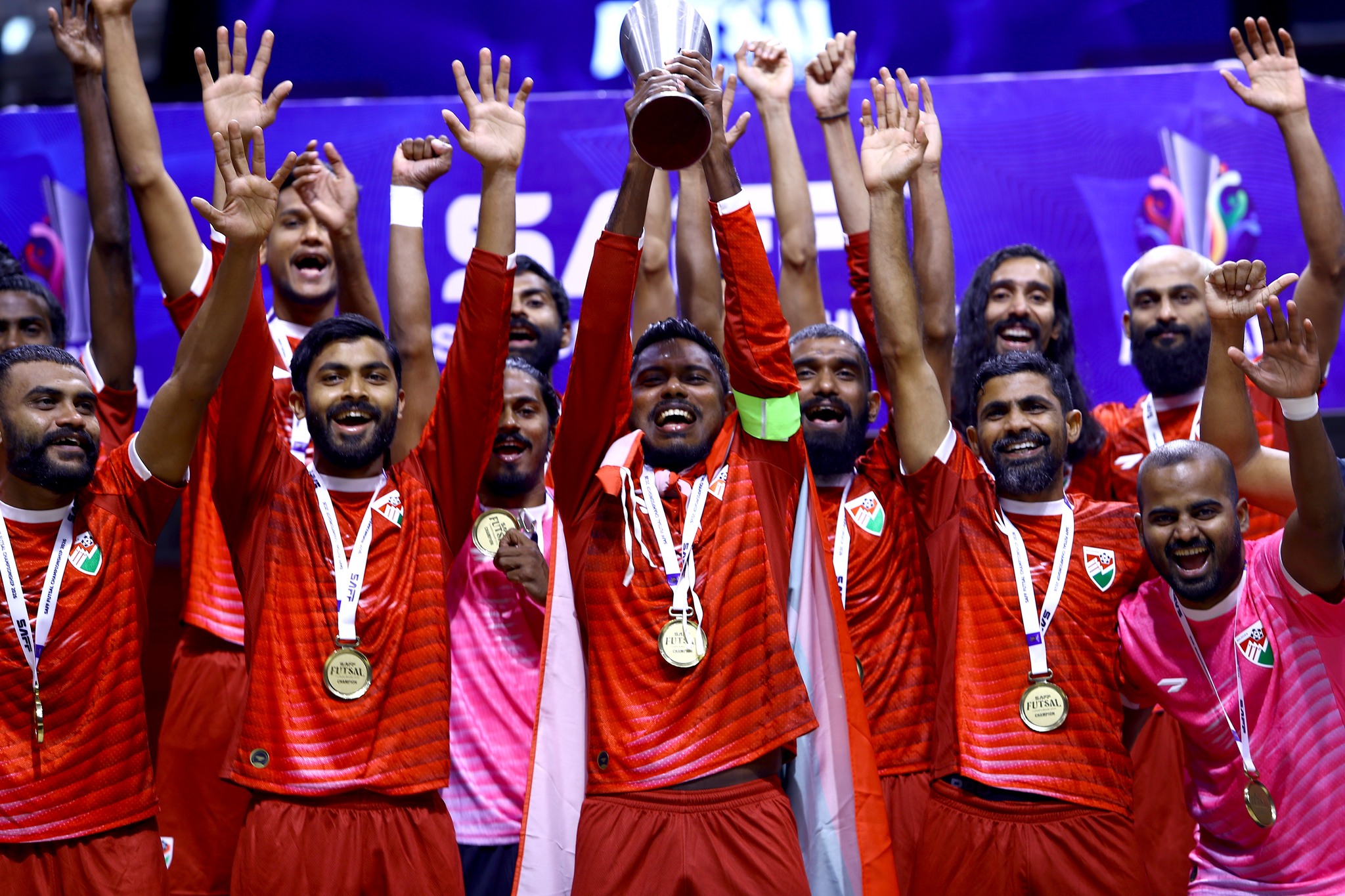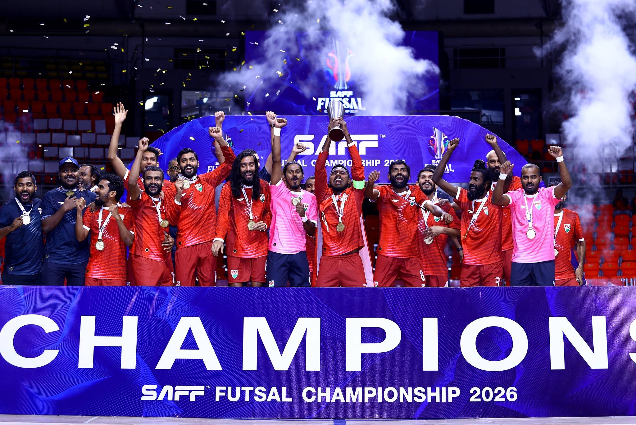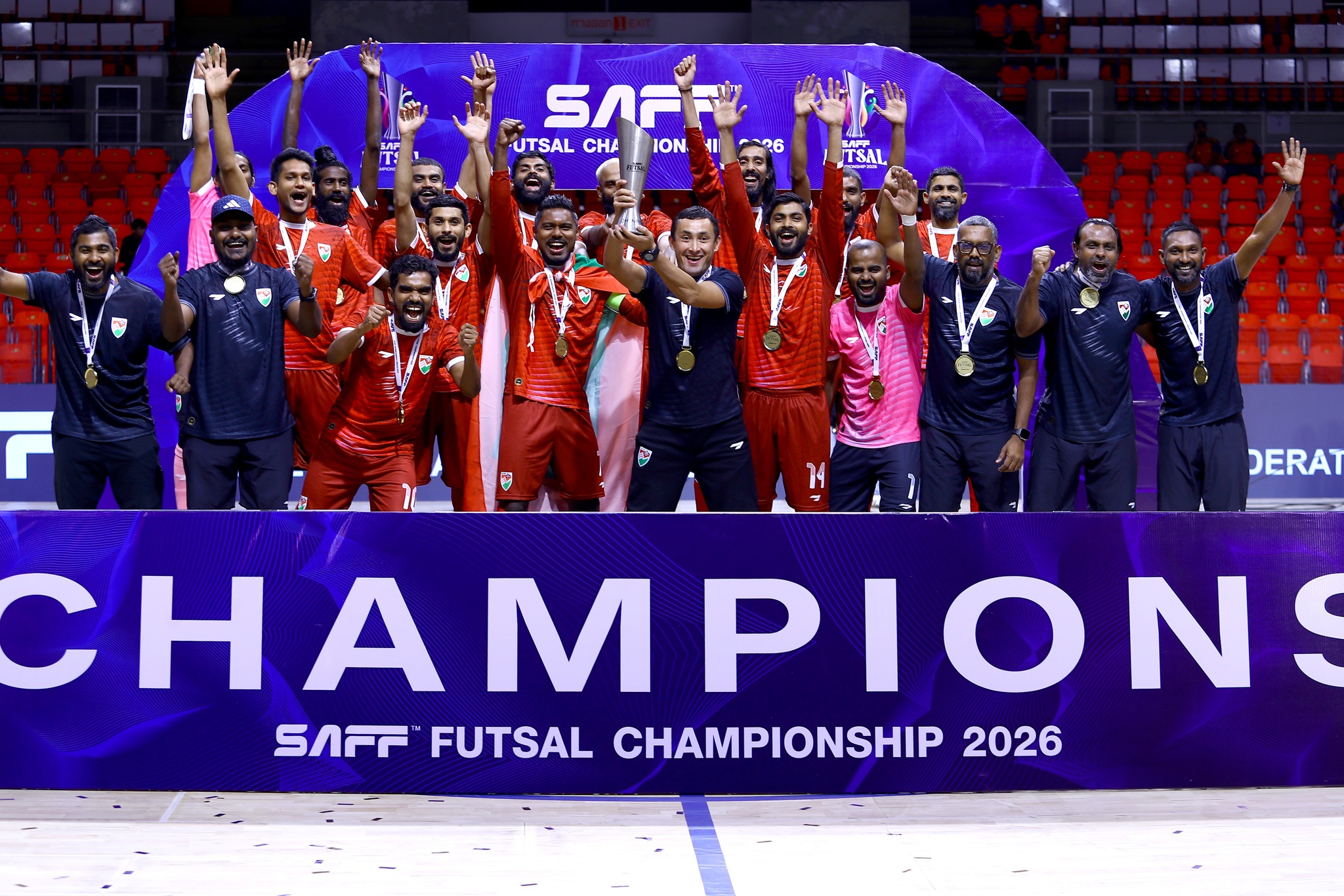 ސާފް ފުޓްސަލް ޗެމްޕިއަންޝިޕް 2026 ގެ ތަށި ދިވެހިޓީމް އުފުލާލާފައިވަނީ މުބާރާތުގައި ކުޅުނު ހުރިހާ މެޗެއް ކާމިޔާބުކޮށްގެން ފޮޓޯ: ސާފް